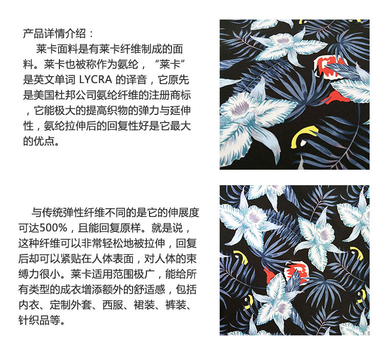 人體束縛力小。萊卡面料適用范圍極廣,能給成衣 內(nèi)衣 泳衣 箱包 鞋材等一些衣物添加