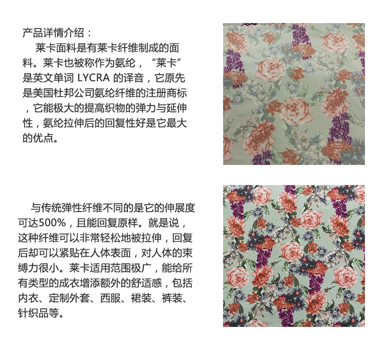 人體束縛力小。萊卡面料適用范圍極廣,能給成衣 內(nèi)衣 泳衣 箱包 鞋材等一些衣物添加