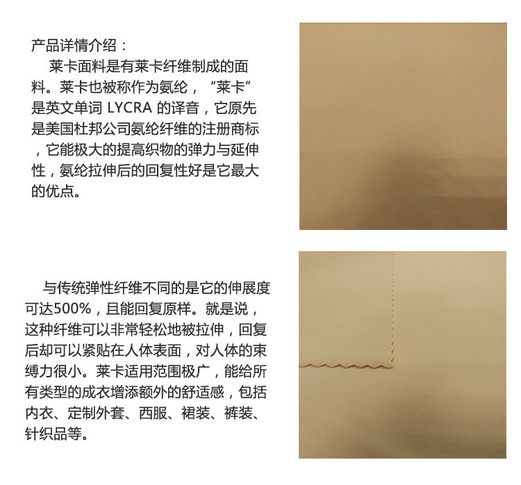人體束縛力小。萊卡面料適用范圍極廣,能給成衣 內(nèi)衣 泳衣 箱包 鞋材等一些衣物添加